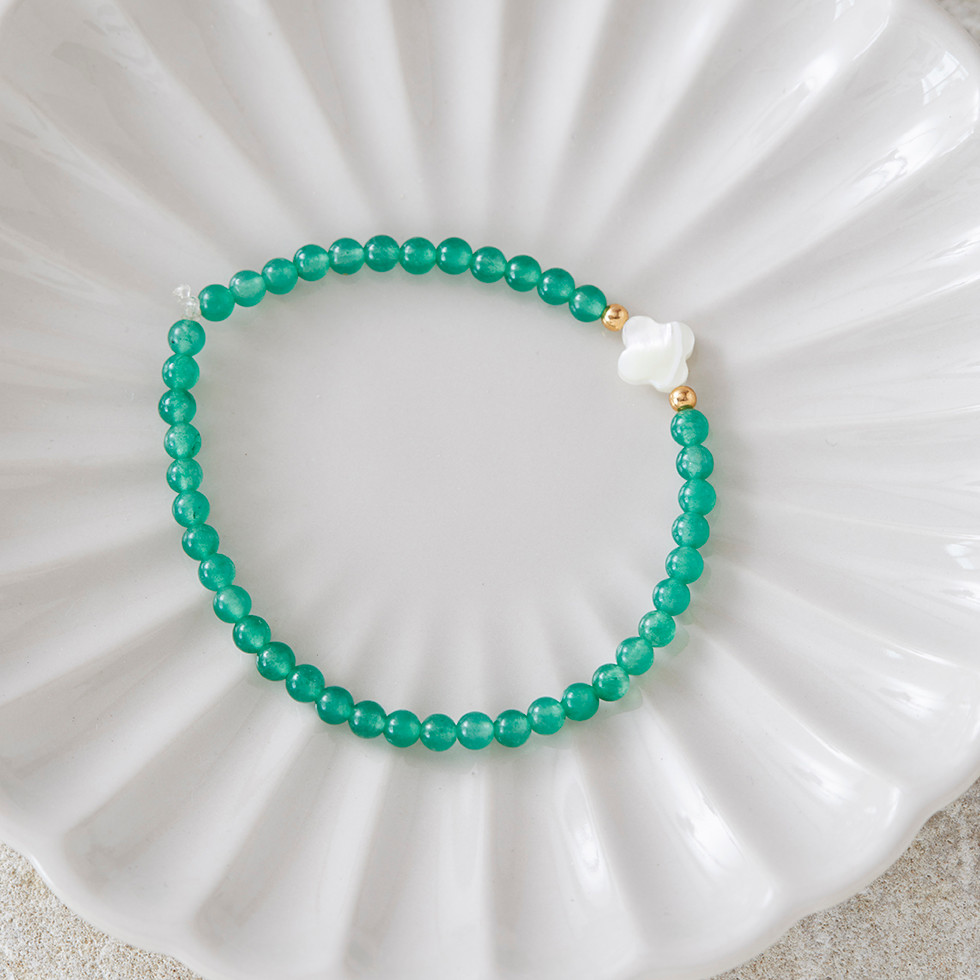Smooth green aventurine beads create a calming, earthy feel to this handcrafted bracelet, elegantly finished with a delicate mother-of-pearl clover charm. A peaceful and grounding accessory, designed to invite good luck and positive energy into your everyday style.